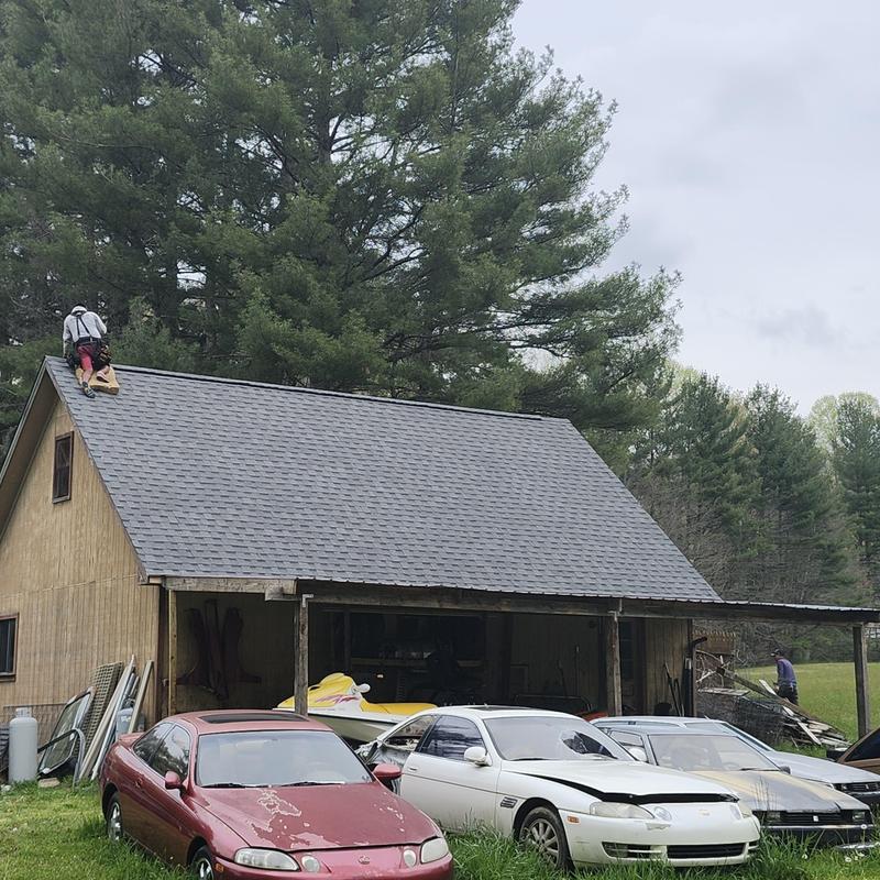 Speedy Pro Roofing replaced shingles on a workshop in Pewter color in Mountain City, Tennessee. The project involved removing old materials and installing new asphalt shingles to improve the building’s protection and durability.